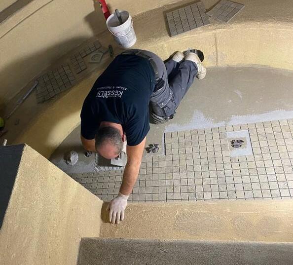 The pool surround consists of eight sections. Each of these has a central floor drain that collects water sloshing out of the pool. In order to create the required gradient, the craftspeople had to fit, lay and grout the mitered tiles very precisely. "With such a symmetrical design, even the smallest errors are immediately visible. Our tilers were very focused and worked with millimeter precision. During the entire construction phase, PCI specialist consultant Markus Mielczarek and application engineer Jörg Hilden were always on hand to provide us with their expertise," emphasizes Thomas Kessels.