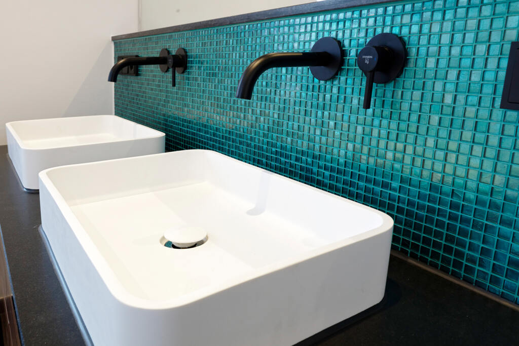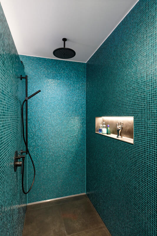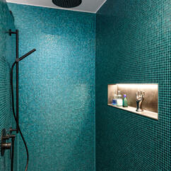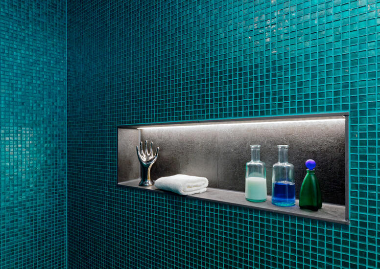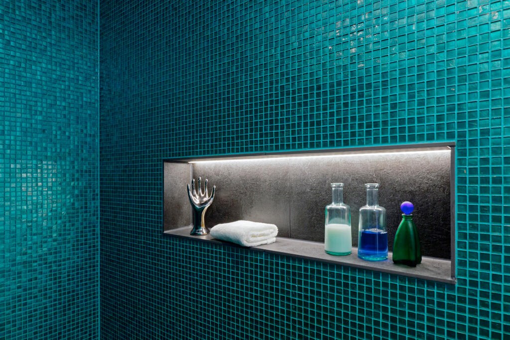 - Joints tone-on-tone with the turquoise glass mosaic in the shower area