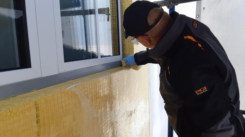 In addition to the huge selection of colors, the high level of processing comfort of the PCI Durapox Premium Multicolor also scores points. Thanks to its smooth consistency, the epoxy resin joint mortar can be used as easily as cementitious mortar, with just one hand and without special tools. The washing behavior also corresponds to that of cement mortars. In combination with PCI Durapox Finish, no residual haze remains. When grouting the gold mosaic tiles, it was also important that PCI Durapox Premium Multicolor can be processed even at low temperatures.