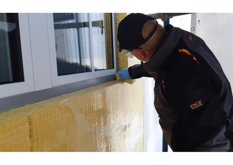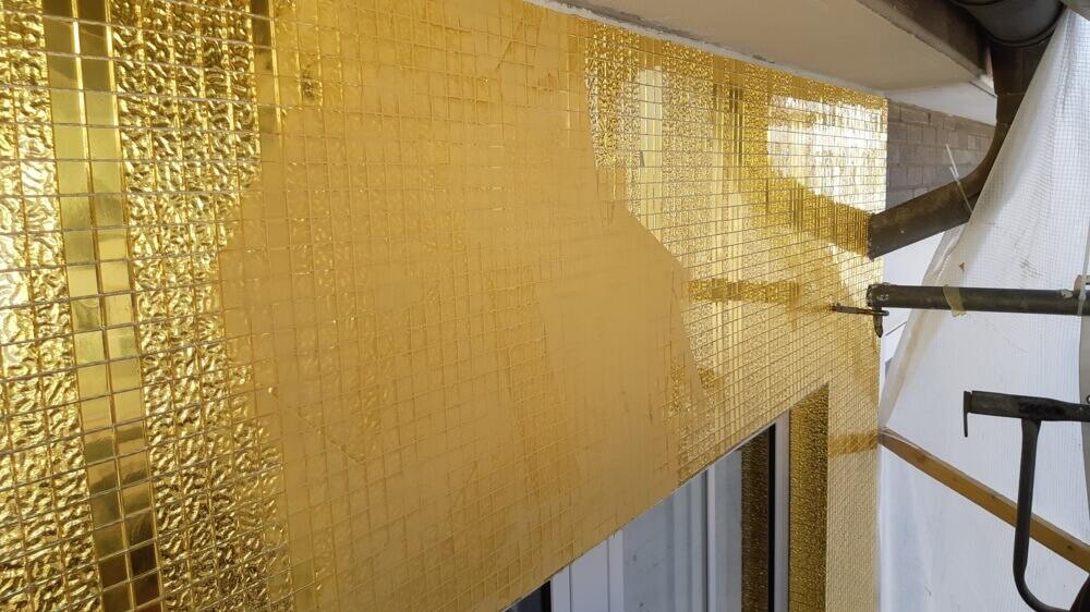 "Everything that glitters is gold: A builder in Neuss, North Rhine-Westphalia, decorated the facade of a commercial building with 51,000 mosaic tiles made of gold leaf. The exactly matching color of the PCI Durapox Premium Multicolor joint mortar perfectly rounds off the extravagant gold mosaic look and made this possible Grouting even at low temperatures.