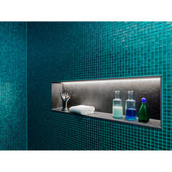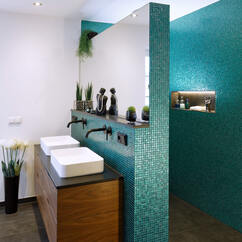 "The client, himself a tiler, wanted to design his bathroom in his new home as a wellness oasis with a very personal touch. He chose elegant glass mosaic for the shower area and wanted the exact same turquoise tone for the grouting. This was made possible by PCI Durapox Premium Multicolor. The New epoxy resin joint mortar had just come onto the market. Using the PCI Durapox Premium color spectrum, he found the right anthracite joint for the 90 x 90 centimeter porcelain stoneware on the floor.