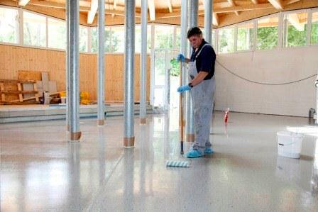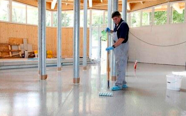 Nutzschicht für die Besucherfläche erstellen, die rutsch- und abriebfest, leicht zu reinigen, sowie bei ansprechender Optik möglichst farbgleich bleibend ist und zudem durch die Fußbodenheizung hervorgerufene thermische Bewegungen im Belag auf nimmt.