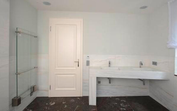 Werkstoffe aus der Natur erzeugen eine wohlige Atmosphäre und bieten mit ihren natürlichen Farben und Musterungen ein schickes Highlight im eigenen Zuhause. Aus diesem Grund entschieden sich die Eigentümer einer Düsseldorfer Wohnung, Marmor für die Einrichtung ihres Badezimmers sowie des angrenzenden Gäste-WCs zu verwenden. Dabei sollten sowohl Wand und Boden bekleidet als auch neue Sanitärobjekte aus dem Naturmaterial gefertigt werden. In Absprache mit dem Architekten legten sich die Bewohner auf zwei unterschiedliche Marmorarten fest: Für insgesamt 28,7 m² Wandfläche in beiden Räumen sowie für das Doppelwaschbecken im Badezimmer und das Handwaschbecken im Gäste-WC wählten sie hellen Göflaner Marmor aus. Der Boden mit einer Größe von 16,45 m² sollte durchgehend mit dem dunklen Fossile Etrusco aus Tunesien belegt werden.
