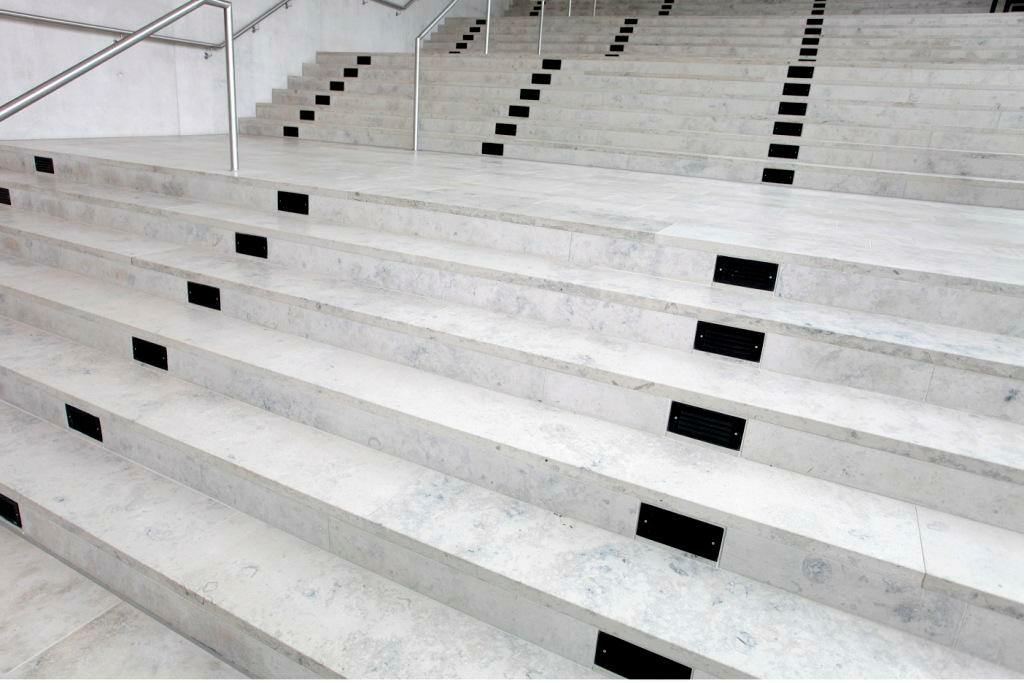 Am 19. Mai 09 starteten die umfangreichen Natursteinarbeiten im CCH mit dem Haupttreppenhaus. Drei Mitarbeiter der Firma Mack und der Chef persönlich verlegten täglich 6 Steigungen der sich nach unten verjüngenden Treppe mit einer Laufbreite von durchschnittlich 10 Metern. Sie betteten den „Jura grau“ in den speziell für das Arbeiten mit Natursteinen bestimmten Ansetz- und Verlegemörtel PCI Carrament grau. Bei der Beurteilung der angegebenen Tagesleistung ist als besondere Herausforderung zu berücksichtigen, dass 120 Aussparungen für Treppenlichter in die Stellplatten eingearbeitet werden mussten. Die Natursteinflächen der Zwischenpodeste der großen Treppe wurden in Trassmörtel gebettet. Bis zum 9. Juni 09 konnte die Arbeit in allen Treppenhäusern abgeschlossen werden, rund 350 lfm. Tritt- und Stellplatten waren schließlich verlegt.