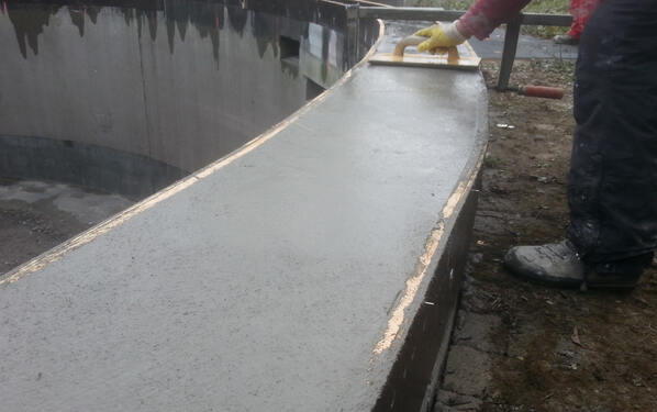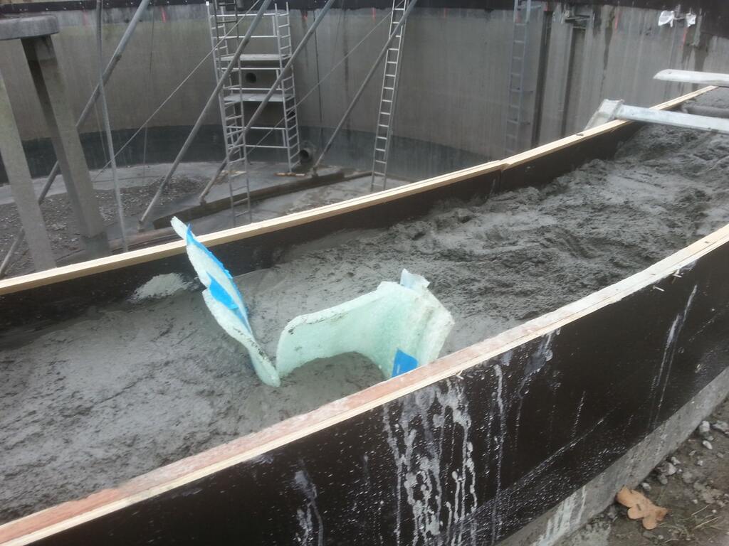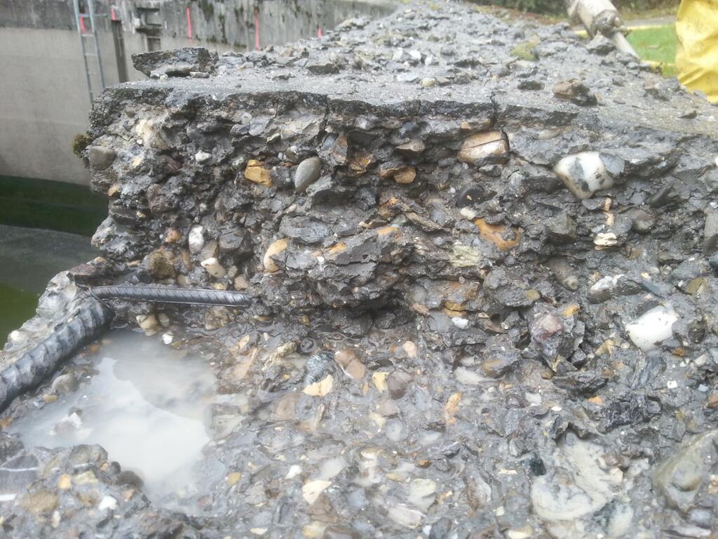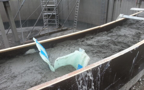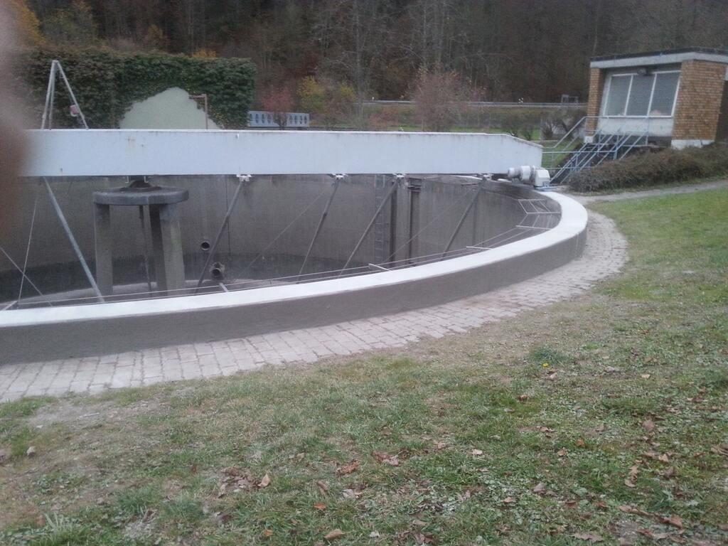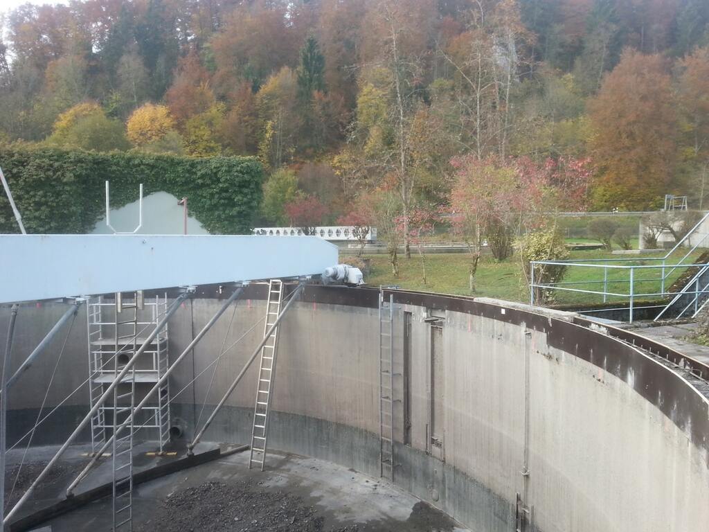 Zu den laufenden Sanierungsmaßnahmen gehörte zuletzt - unter der Leitung des Ingenieurbüros Hertkorn aus Sindelfingen - die Renovierung der Räumerlaufbahn. Eine grundlegende Betoninstandsetzung war erforderlich, um den störungsfreien Betrieb der Kläranlage zu garantieren. Die Anforderungen an die Fahrbahnen für die Räumer-Laufräder sind hoch. Neben den üblichen Einwirkungen auf ein Außenbauteil müssen sie den Druck- und Schubkräften der Laufräder widerstehen und auch Hilfsmitteln standhalten, die beispielsweise zur Eisfreihaltung im Winter eingesetzt werden. Die Oberfläche muss frei von Ausbrüchen und Graten sein, und bei jeder Witterung griffig. Für diese Anforderungen und eine dauerhafte und sichere Ausführung der Betoninstandsetzung ist ein hochwertiger Betonersatzmörtel ein absolutes Muss.