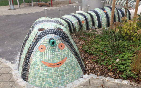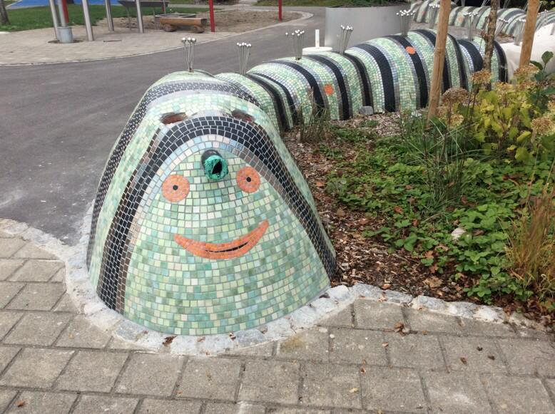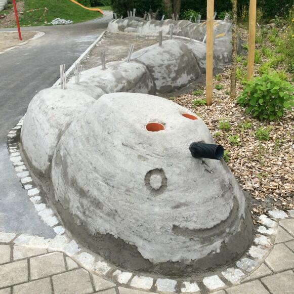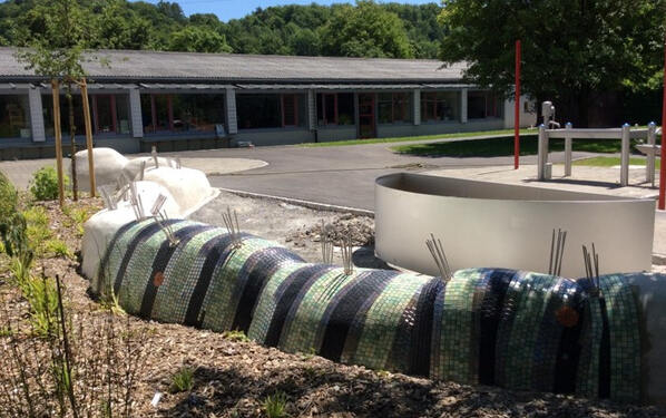 Die Mosaik-Raupe mit unterschiedlichen Elementen zur Sinneswahrnehmung ist ein bedeutender Teil des pädagogischen Konzeptes im neu gestalteten Schulgelände. Nicht nur die 46 Schüler und Kindergartenkinder an der Wutach-Schule freuen sich über das attraktive Schulgelände, sondern alle Kinder, die den öffentlich zugänglichen Spielplatz besuchen.