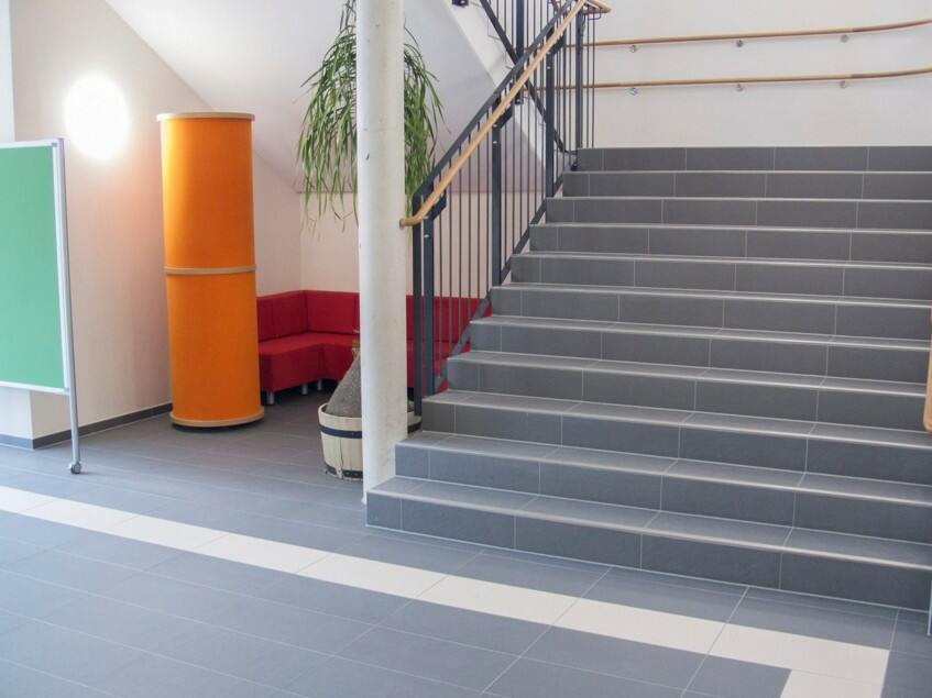 Im direkten Einzugsgebiet und Nordosten der Metropole Berlin liegt die Stadt Bernau. Aufgrund der guten Verkehrsanbindung und des hohen Freizeitwertes zieht der Ort verstärkt junge Familien an. Um den ständig steigenden Schülerzahlen zu entsprechen, wurde im Ortsteil Schönow ein neuer Schulkomplex errichtet. Den Zuschlag für die Befliesung der rund 1.000 m2 Boden- und rund 500 m2 Wandflächen in Fluren, Treppenhäusern und Toiletten bekam die Keramik KG Norbert Fechner aus Guben, die seit 25 Jahren ausschließlich mit PCI?Produkten arbeitet. Bereits in der Vorbereitungsphase standen Fachberater Frank Scholz und Anwendungstechniker Andreas Albert beratend zur Seite. Eine besondere Herausforderung vor der eigentlichen Fliesenverlegung stellten die Maßabweichungen zwischen Rohbau und dem Fliesenausbau dar.