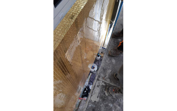 Verlegen und Verfugen von 51.000 Mosaik-Plättchen aus Blattgold an einer Gebäudefassade