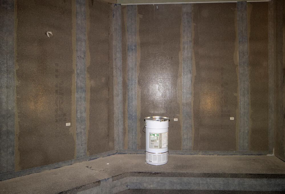 Nach Aufbau der Foliensichtschutzwand nahm Peters zunächst das Aufmaß für das neue, rund 26 Quadratmeter große Dampfbad, da Pläne vom bisherigen fehlten. Dabei berücksichtigte er auch die Abluftkanäle über dem Dampfbad. Nach dessen Rückbau und der Reinigung des Betonbodens erfolgte der Vorstrich mit der Spezial-Grundierung PCI Epoxigrund 390 und der Einbau des Epoxidharzstrichs, bestehend aus PCI Epoxigrund 390 abgemischt mit PCI Quarzsand II. Gemäß seiner Planung und der Freigabe-Zeichnung baute der Fliesenlegermeister anschließend das komplette Dampfbad – Wände, Decke, Sitzbänke und auch den Dampfbrunnen – aus vorgefertigten, wasserundurchlässigen Hartschaumträgerelementen auf. Die Stöße der einzelnen, maßgenauen Elemente an Wänden und auf den Sitzbänken versah Peters mit einem Armierungsgewebe und spachtelte dieses mit dem leichten variablen Flexmörtel PCI Nanolight® ein.