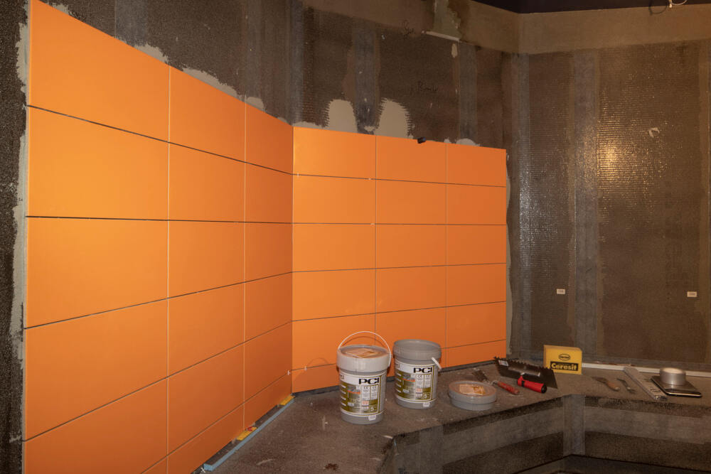 Für die Wände hatte der Bauherr orangefarbene Fliesen ausgesucht, für den Boden das beige Interni-Mosaik „Flooring Seta“ mit der Rutschhemmungsklasse B. Beides verklebte Wolfgang Peters mit dem Epoxidharzmörtel PCI Durapox® Premium. Für die geflammten und gebürsteten Granitplatten „Nero Assoluto“ auf den Sitzbänken verwendete er den verformungsfähigen, schnell abbindenden Dünnbettmörtel PCI Carraflex®. PCI Durapox® Premium kam in der Farbe Sandgrau für das Verfugen aller Fugen an Wänden und auf Sitzbänken und dem Boden zum Einsatz. Der Epoxidharzfugenmörtel eignet sich mit seiner farbbrillanten, homogenen Fugenoberfläche hervorragend für optisch hochwertige Beläge wie Mosaik. „Ich habe PCI Durapox® Premium schon öfters verarbeitet und bin begeistert. Der Fugenmörtel lässt sich sehr einfach und so geschmeidig wie zementärer Mörtel verarbeiten und auch problemlos abwaschen. Die Fugen bleiben dauerhaft schön, formstabil und sind für den Bauherrn leicht zu reinigen“, sagt Peters. Auch PCI Durapox® Premium und PCI Carraflex® sind sehr emissionsarm nach GEV EMICODE EC1 PLUS.