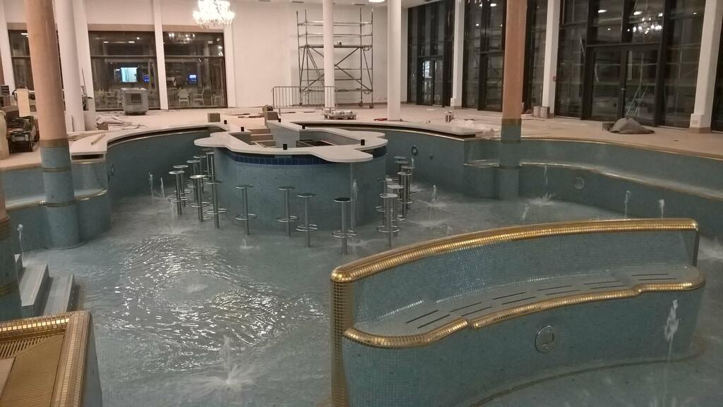 Für die Abdichtung kam im Kristall trimini die schnellabbindende Sicherheits-Dichtschlämme PCI Seccoral 2K Rapid im Becken der Poolbar und an Wand und Boden aller nassbelasteten Bereiche zur Anwendung. PCI Seccoral 2K Rapid ist einsetzbar für die Beanspruchungsklassen A und B nach Bauregelliste A Teil 2/1.10 und für die Wassereinwirkungsklassen W0-I, W1-I, W2-I, W3-I gemäß der neuen Abdichtungsnorm DIN 18534 (Abdichtung von Innenräumen). Für Schwimmbecken und Behälter gilt die DIN 18535. Wie alle PCI-Abdichtungsprodukte ist PCI Seccoral 2K Rapid normkonform hinsichtlich der neuen Regelwerke. Die Verbundabdichtung ist entkoppelnd, spannungsabbauend und rissüberbrückend und bietet damit hohe Sicherheit auch bei nachträglich auftretenden Rissen. Im Whirlpool und in Becken, die mit Natron angereichertem Wasser befüllt werden, kam eine GFK-Abdichtung (glasfaserverstärkte Kunststoffe) zum Einsatz. Neben den Abdichtungsarbeiten galt es die Betonüberdeckung des Bewehrungsstahls im Becken der Poolbar korrosionssicher zu gestalten. Durch Auftragen des Universalreparaturmörtels PCI Nanocret R3 wurden einzelne Stellen auf das erforderliche Maß erhöht.