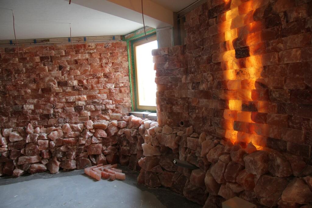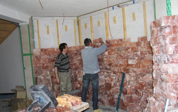 Eine Wellness-Oase ganz aus Salz verwirklichte das Ehepaar Günther in Trinwillershagen unweit der Ostseeküste. Ein Salzkristall stand Pate für den sechzehn-eckigen Grundriss der Salztürme auf einer Grundfläche von rund 100 m2. 38 Tonnen Salz aus Pakistan ließen die Günthers für die Innenauskleidung einschiffen, 32 Tonnen davon wurden als Fliesen, Brocken und Ziegel verbaut. Im Erdgeschoss und im ersten Obergeschoss sollten rötlich schimmernde Salzplatten und Bruchsteinmauerwerk die Wände und Böden verkleiden. Für den Bereich Massage & Wellness im zweiten Obergeschoss entschieden sich die Bauherren für das fast weiße, durchscheinende Halitsalz.