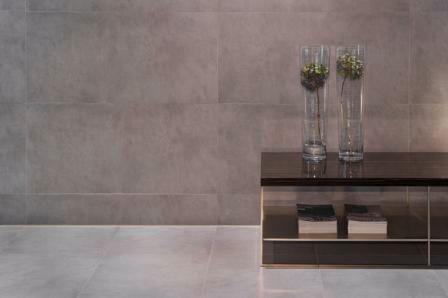 Um den neuen Fliesen eine vernünftige Haftung zu ermöglichen, musste der Boden zunächst komplett abgeschliffen werden. Danach konnte die Spezial-Grundierung PCI Epoxigrund 390 aufgebracht und mit Quarzsand (Körnung 0,3 bis 0,8 mm) abgestreut werden. An die vorbereiteten Boden- und Wandflächen brachten die Verleger großformatige Fliesen an. Dabei wählte der Auftraggeber Platten der Serie Microcement im Farbton grey der Marke Apavisa. Diese bekleiden jetzt im quadratischen Format 60 x 60 cm den Boden und in der Größe 60 x 120 cm die Wand. Um die Verbindung zwischen Untergrund und Fliese zu gewährleisten, griffen die Bauprofis auf den schnellen und leichten Flexmörtel PCI Rapidlight zurück. Schon nach drei Stunden konnten die neuen Fliesen im Ladenlokal begangen und mit der neuen Geopolymer-Komfortfuge PCI Geofug verfugt werden. Genau wie bei den Accessoires, die die ausgestellten Möbelstücke in ihrer Präsentation ausgewogen unterstützen, wurde ebenfalls bei Boden- und Wandbelag darauf geachtet, vollkommenen Einklang bis ins kleinste Detail zu schaffen: Daher fiel auch die Wahl auf die Fuge PCI Geofug, die mit ihrer keramikähnlichen Oberfläche ein geschlossenes Bild auf Boden und Wand schafft. Ein weiteres Plus der Fuge: Nicht entfernte Schmutzreste oder bestimmte Schimmelpilzarten zersetzen sich unter Einfluss von Licht auf der PCI Geofug-Oberfläche selbst. Im Einklang mit Fliesen und Fugen wurden zu guter Letzt auch die vorhandenen Eck- und Anschlussfugen mit dem elastischen Silikon-Dichtstoff PCI Silcoferm VE verschlossen – selbstverständlich im entsprechenden Farbton zementgrau.