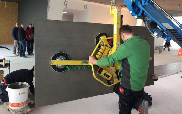 Mit dem Verlegekran konnten die Arbeiten im Betriebsrestaurant schneller und vor allem leichter ausgeführt werden. Gerade das Anheben, Tragen und Positionieren von Großformaten stellt ein gesundheitliches Risiko für die Fliesenleger dar. Mit Maschinentechnik lässt sich der Arbeitsablauf beim Buttering-Floating-Verfahren zusätzlich verkürzen: Die Handwerker müssen die Platten zum Einstreichen der Rückseite nicht mühsam wenden und auch das Aufsetzen der Handsauger auf der Vorderseite entfällt. Platten, die schon in das Kleberbett eingelassen sind und der Korrektur bedürfen, lassen sich einfach und für die Handwerker rückenschonend anheben. Bei deutlich geringerer körperlicher Belastung entfallen Arbeits- und Wartezeiten.