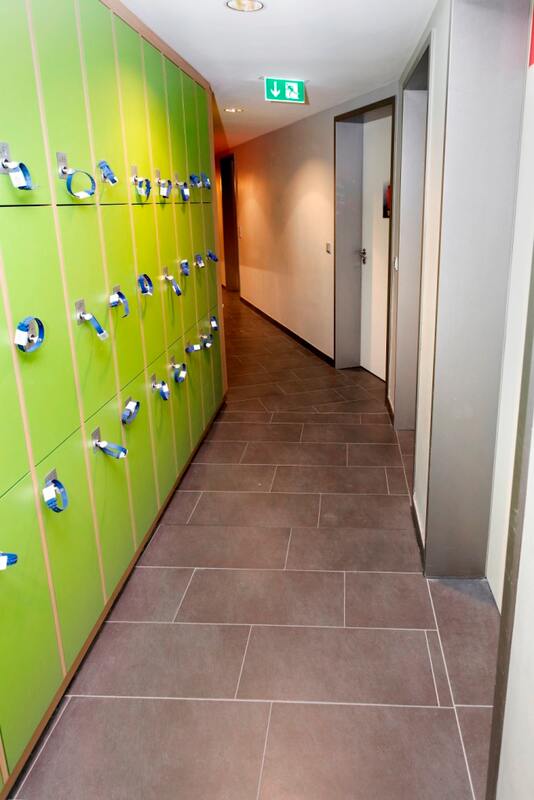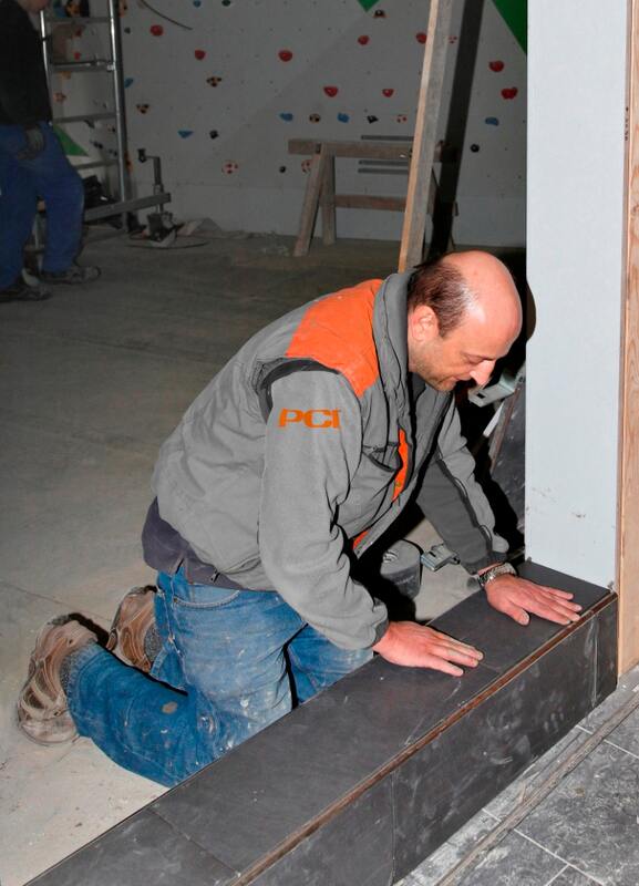 Die Böden der Sanierungsflächen im Altbau sowie die des gesamten Neubaus sind Zementestrich. Entsprechend ihrer späteren Nutzung mussten die Untergründe unterschiedlich vorbereitet werden. Zunächst wurde die gesamte Fläche von 1.400 Quadratmetern mit PCI Gisogrund 303 für glatte, nicht saugende Untergründe grundiert. Die Böden der Duschen und WCs wurden mit der Sicherheitsdichtschlämme PCI Seccoral 1K abgedichtet. An den Wänden der Sanitärräume sowie in der Küche des Bistros und im Griffelager kam PCI Lastogum zum Einsatz, eine flüssige Flächenabdichtung, die speziell für Feucht- und Nassräume entwickelt wurde. Zur Entkopplung des Fliesenbelags vom Untergrund wurden auf sämtlichen Böden PCI Pecilastic U ausgelegt, eine druckstabile Abdichtungs- und Entkopplungsbahn. Ihr mehrschichtiger Aufbau reduziert zusätzlich den Tritt- und Raumschall, was ein angenehmes Raumklima schafft.