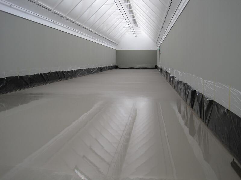 Für die außergewöhnliche Ausstellung sollte die Ausstellungshalle von 70 m Länge und 8,5 m Breite möglichst naturnah als Betonhoffläche gestaltet werden. Der Untergrund bestand aus 43 mm starken Holzdielen, ausgebildet als Schwingboden. An den geplanten zementären Untergrund stellten sich folgenden Anforderungen: Einerseits musste die rückstandsfreie Entfernung nach Ende der Ausstellung garantiert sein, andererseits sollte der Untergrund der Belastung durch den zu erwartenden Besucheransturm gewachsen sein und gleichzeitig vermieden werden, dass sich ein möglicher Abrieb des Untergrundes im Hause verteilte. Nach intensiven Gesprächen mit Herrn Dipl.-Ing. Ingo Grollmisch von der anwendungstechnischen Abteilung der PCI Augsburg GmbH wählte die ausführende Firma Grafite GbR aus Darmstadt folgenden Aufbau: