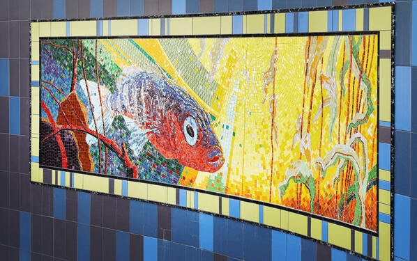Interessierte Besucher können sich vor Ort über die Fischwanderungen informieren, und die Fische dabei sogar beobachten. In einem an die Stiege angrenzenden, unterirdischen Raum gibt eine große Glasscheibe den Blick frei auf die Fischtreppe. Das Besondere daran ist die kunstvolle Gestaltung: An den Wänden und auch an einer Mauer im Außenbereich hat Fliesenlegermeister Edwin Harbers beeindruckende Fischmotive mit einer Länge von bis zu vier Metern mit Mosaiken verlegt. Anhand der Entwürfe des Künstlers Paul Wieggers legte er die Glasmosaike in seiner Werkstatt in bis zu 80 unterschiedlichen Farben auf 3,5 Zentimeter starke Kerlite-Platten ein. Die fertigen Werke montierte und verfugte Harbers anschließend vor Ort. Eine aufwendige Arbeit: Bis zur Fertigstellung flossen rund 200 Arbeitsstunden in jedes Fischmotiv.