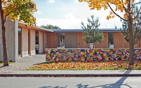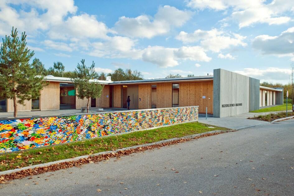 Das Ingeborg Ortner-Kinderhaus wurde im Oktober 2010 eröffnet und bietet Kindergarten- und Krippenplätze für die Mitarbeiter und Studenten der TU München. Die Baukosten von 1,6 Mio Euro stiftete das Münchner Ehepaar Ingeborg und Johannes Ortner. Der Architekt, Professor Hermann Kaufmann, gestaltete das höchst flexible und am neuesten Stand der Holzbautechnik orientierte Gebäude. Mit der Legomauer im Eingangsbereich schuf die Künstlerin Tina Haase, Professorin für "Bildnerisches Gestalten" an der Fakultät Architektur, das Corporate Identity des Kindergartens und setzte damit ein Zeichen für die Technische Universität, für ihre neu angestrebte Frauen- und Kinderfreundlichkeit, für moderne zeitgenössische Architektur und für neue künstlerische Innovation. Frau Prof. Haase wählte das Material „Lego“ aufgrund der Farbigkeit und Zweckmäßigkeit für die Verkleidung der Brüstung, die allen Witterungen standhalten muss. Als Schnittstelle zwischen Innen und Außen, zwischen Kinderwelt und Erwachsenenwelt, weckt das Material Erinnerungen an alte Sehnsüchte und erzeugt mit seinen extrem malerischen Flimmer-Qualitäten Energie und Vitalität.