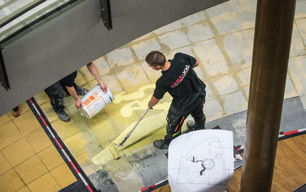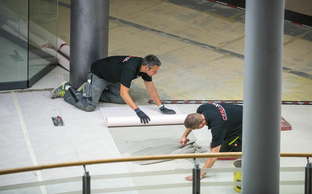 Der erste Arbeitsschritt bestand im Abfräsen und Abschleifen des vorhandenen Betonwerksteinbelags. Hohllagigkeiten wurden ausgebessert, offene Fugen mit dem geruchsneutralen Silikat-Gießharz PCI Apogel SH verschlossen. Anschließend folgten das Grundieren mit PCI Gisogrund 303 und Setzen von Höhenpunkten für die Ausgleichsschicht. Um nachträglich auftretende Spannungen und ggf. neu auftretende Untergrundrisse zu kompensieren, verklebten die Handwerker die Entkopplungsbahn PCI Pecilastic auf dem vorbereiteten Untergrund. Hierfür kam der hochverformungsfähige PCI Flexmörtel S2 Rapid zur Anwendung.