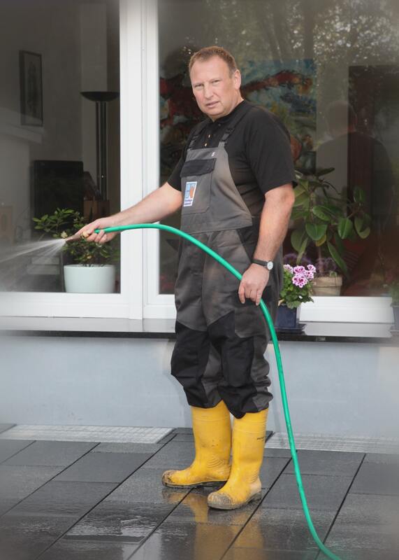 Auf der vorhandenen Betonplatte aus Basaltguss wurden die Bodenplatten „Granit COLOMBO anthrazit – grau“ (60x30x3 cm) auf rund 50 m² verlegt. Für die Verfugung hatte der Bauherr die Fläche am Vorabend mit Wasser beaufschlagt, am folgenden Tag erfolgte die Verarbeitung von PCI Pavifix 1K Extra mit vier Mann innerhalb von zweieinhalb Stunden inklusive Vor- und Nachbereitung. Mit einem Lippengummischieber arbeiteten die Gartenbauer den Pflasterfugenmörtel unter permanenter Wasserbeigabe ein, um ein Nachsacken der Fugen zu vermeiden. Die Anschlussfugen zu Nackenstützen und Hausanschlüssen wurden ebenfalls mit PCI Pavifix 1K Extra verfüllt. Circa zehn Minuten nach dem Einschlämmen fegten die Mitarbeiter der Firma Hirschelmann die frisch verfugte Bodenfläche mit einem leicht feuchten Kokosbesen, nach rund zwei Stunden konnten die letzten Mörtelreste beseitigt werden. Äußerst zufrieden zeigte sich der Bauherr mit dem Gesamtbild seiner neuen Terrasse. Dass eine dauerhaft attraktive und unkrautfreie Pflasterfläche in kürzester Zeit so professionell verfugt werden kann, hatte er nicht erwartet.
