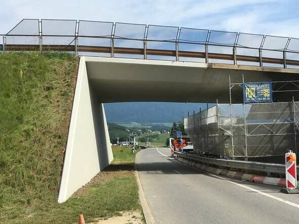 La face inférieure du pont et les murs de soutènement ont été recouverts du système de protection de surface PCI Betonfinish W dans la couleur RAL 7045. Pour que les surfaces du béton soient protégées contre les nouveaux sels de déglaçage.