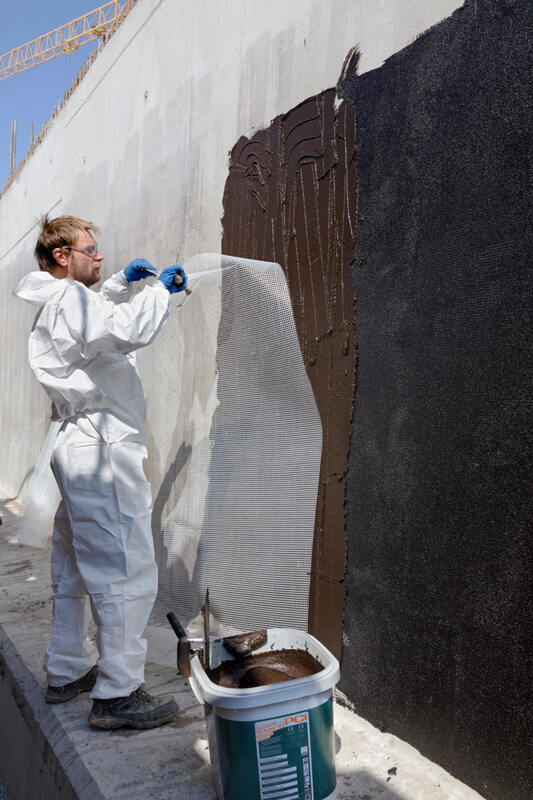 Bei der Abdichtung der Tiefgaragenwände von außen kam das System PCI Pecimor zum Einsatz. Die polymermodifizierte Bitumendickbeschichtung (PMBC) erfüllt die Anforderung an normgerechte Abdichtung nach DIN 18533 Teil 3 und bietet Sicherheit durch die im System geprüften und aufeinander abgestimmten Produkte: Die Untergrundvorbereitung erfolgte mit der Spezial-Grundierung PCI Pecimor Betongrund. Für die Abdichtung verwendeten die Verarbeiter PCI Pecimor 2K zweilagig mit Gewebebahn zwischen den Schichten. Die Bitumen-Dickbeschichtung eignet sich für die Lastfälle W1-E bis W4-E. Für den Lastfall W1-E sowie auch für W4-E bietet das Abdichtungssystem alternativ PCI Pecimor 1K. Vorteile beider Bitumen-Dickbeschichtungen sind die hohe Flächenleistung sowie ihr hoher Verarbeitungskomfort – sie lassen sich dank homogener Polystyrolfüllung sehr leicht und kraftsparend verarbeiten. Die gute Standfestigkeit ermöglicht einen gleichmäßigen Materialauftrag. Damit lässt sich die entsprechende Schichtdicke gemäß Normvorgabe sicher erreichen. Nach dem ersten Arbeitsgang folgt die PCI Gewebebahn, darauf die zweite Schichtlage. Beide Bitumen-Produkte sind extern geprüft und stabil gegen Auflösung bei weichem Regenwasser.