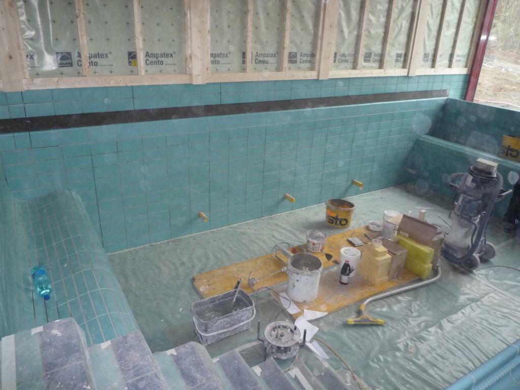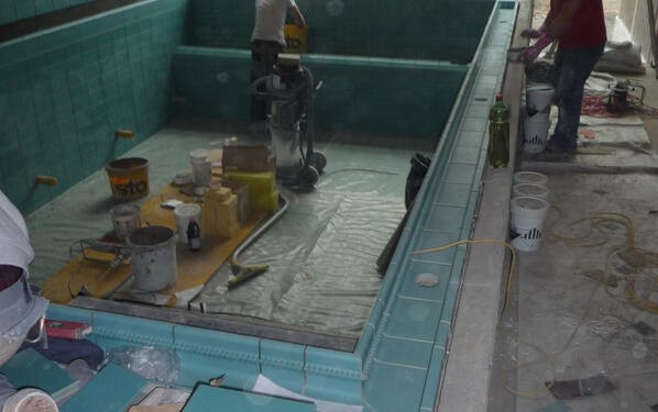 Das Schwimmbecken wurde komplett neu aufgebaut. Sämtliche Einbauteile wurden mit PCI Aposan aufgefüllt. Anschliessend wurden die Einbauteile mit PCI Epoxigrund 390 grundiert, danach abgesandet, um eine optimale Untergrundhaftung zu erreichen. Wände und Boden wurden mit PCI Pericret überspachtelt, um Unebenheiten und Gefälle auszugleichen. Abgedichtet wurde mit PCI Seccoral 2K in zwei Schichten, um die geforderten 2 mm zu erhalten. Eck- und Bodenanschlüsse wurden mit PCI Pecitape 120 und PCI Pecitape 90° A und 90° l abgedichtet. Einbauteile wurden mit PCI Pecilastic W abgedichtet. Die Kapillarsperre wurde beim Beckenkopf mit PCI Apoten ausgebildet. Wand- und Bodenplatten wurden mit PCI FT Extra verklebt. Das Ausfugen der Wand- und Bodenplatten wurde mit dem Fugenmaterial PCI Durapox NT plus gemacht. Die Wand- und Bodenanschlüsse wurden fachgerecht mit dem elastischen Dichtstoff PCI Silcoferm VE ausgebildet.