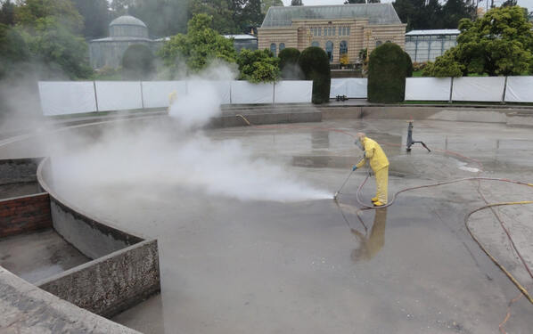 Rückblick: Nach über einem halben Jahrhundert Bestehen konnte Ende 2012 die Sanierung nicht mehr vermieden werden. Helmut Gekeler von der Technischen Abteilung der Wilhelma holte dazu Spezialisten in die Anlage, die innerhalb von fünf Monaten inklusive einem Winterbaustopp dem großen Becken eine Frischekur verabreichten. Unter fachmännischer Betreuung von PCI-Fachberater Erhard Kuttler und PCI-Anwendungstechniker Peter Scharping arbeiteten drei regional ansässige Baufachunternehmen daran, den Seerosenteich instand zu setzen. Zu Beginn der Arbeiten mussten die Pflanzen weichen. Die Leerung offenbarte ein Bassin, das weder funktionalen noch ästhetischen Ansprüchen genügte. Zunächst wurden die Betonflächen durch Wasserhöchstdruckstrahlen mit über 800 bar bearbeitet. Nach der Reinigung überzogen die Sanierungsexperten die Wände des Beckens mit einem PCC-Feinspachtel, der Spezial-Zementmörtel-Mischung PCI Nanocret FC. Der Wandbereich im Innern des Teiches war bereits nach diesem Arbeitsschritt abgeschlossen. Auf der Bodenfläche galt es, Risse durch Tränkung zu schließen: An dieser Stelle kam das Gießharz PCI Apogel F zum Einsatz. Danach galt es, eine neue glatte und intakte Estrichfläche herzustellen. Damit sich der neue Estrich kraftschlüssig und dauerhaft mit dem Untergrund verbindet, verwendeten die Bauprofis die Systemhaftschlämme PCI Repahaft. Die Verarbeiter brachten den Estrich, hergestellt aus Estrich-Kiessand und Estrich-Schnellzement-Bindemittel PCI Novoment Z3, in die noch feuchte Haftbrücke ein und erstellten damit eine funktionale Fläche für den Seerosenteich. Bevor die Fachleute dann die denkmalgeschützten Kronensteine wieder an ihren alten Platz legen konnten, mussten sie den Beckenkopf reprofilieren. Hierbei kam das Epoxi-Bindemittel PCI Bauharz abgemischt mit einem kornabgestimmten Quarzsand zum Einsatz. Zum Abschluss die Fugen: Für die bessere Haftung des Fugendichtstoffes arbeiteten die Sanierungsspezialisten mit der Haft-Grundierung PCI Elastoprimer 110. Verfugt wurden die Zwischenräume der Natursteinblöcke mit PCI Escutan TF. Dank der geprüften Materialien der PCI Augsburg GmbH sowie dem Know-how der verarbeitenden Betriebe ist sowohl ein schönes als auch stabiles und den erhöhten Anforderungen gerecht werdendes Bassin entstanden.