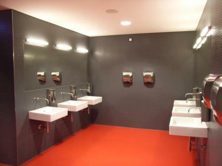 Verlegung von großformatigem Feinsteinzeug an Bodenflächen in Foyer, Verlegung von keramischem Mosaik an Wandflächen in Sanitär- und Umkleideräumen, Verlegung von Wand- und Bodenfliesen in Küche und Lagerbereich