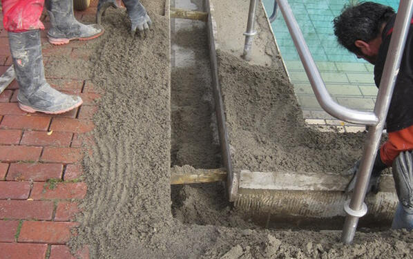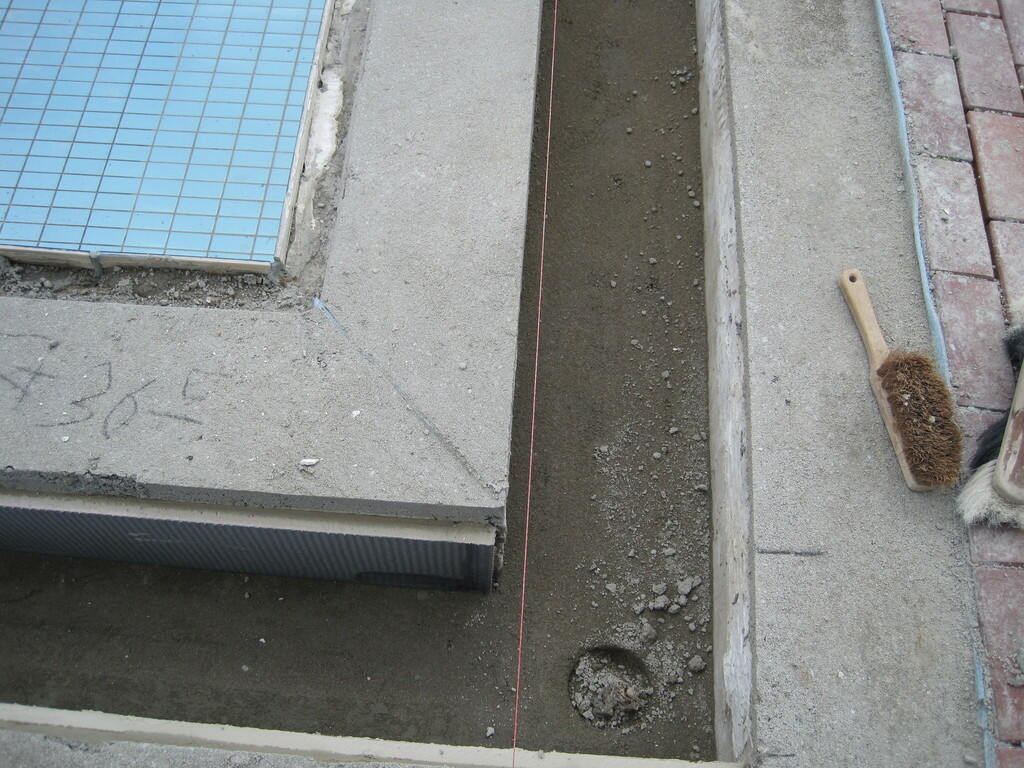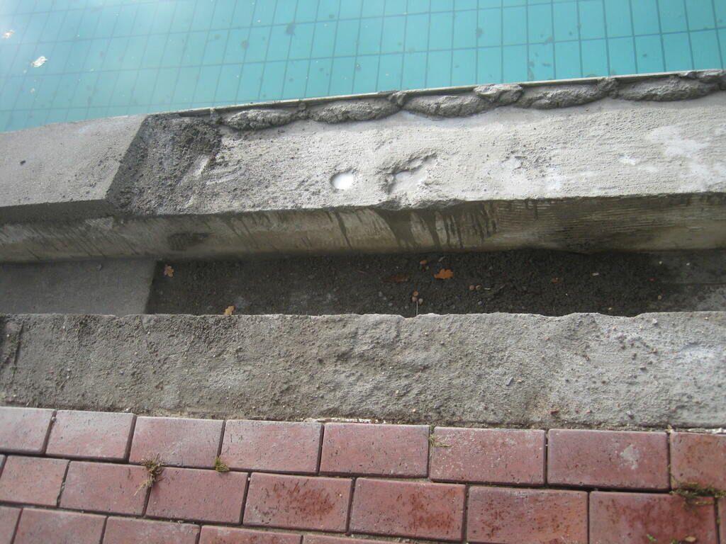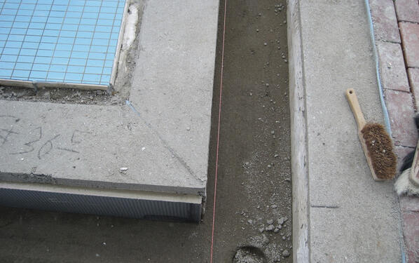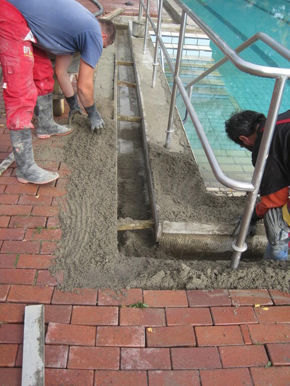 Im Herbst 2009 begannen die Stemmarbeiten am Sprungbecken. Vier Fliesenleger waren durchgehend mit der Sanierung beschäftigt. Jeweils im Herbst wurden die Arbeiten aufgenommen und – je nach Härte des Winters – im Frühjahr fortgesetzt. Insgesamt wurde der Beckenkopf auf einer Länge von ca. 150 m am Schwimmerbecken, ca. 180 m am Nichtschwimmerbecken und ca. 60 m am Sprungbecken saniert. Dabei musste sukzessive an allen Becken der komplette Altaufbau im Beckenkopfbereich entfernt bzw. von Rinnensteinen und altem Verlegemörtel bis auf den tragfähigen Betonuntergrund befreit werden. Anschließend brachten die Mitarbeiter der Firma Hoffelner den Beckenkopf mit einem PCI Schnellzement-Estrich auf die erforderliche Höhe.