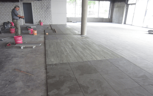 Einbau von Unterlagsboden und Verlegung von Feinsteinzeugplatten nach drei Tagen