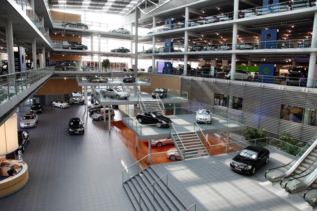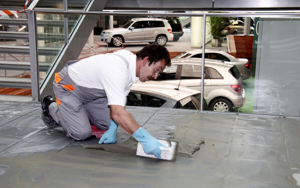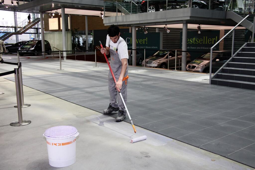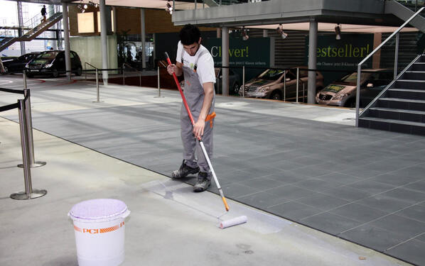 Im Mercedes-Benz Center München werden auf rund 14.000 m² Fläche Neu-, Jahres- und Gebrauchtfahrzeuge präsentiert und verkauft. Der großzügige über mehrere Etagen hohe Raum des Atriums mit seinem Glasdach und zwei über Treppen erreichbaren Podesten bietet jede Voraussetzung für eine elegante Präsentation. Lediglich die Bodenfläche, die mit einer offenporigen Beschichtung aus Epoxydharz und Quarzsand versehen war, erwies sich als ungeeignet. Trotz intensiver Bemühungen war sie kaum zu reinigen. Starke Verschmutzungen und Rissbildung veranlassten den Eigentümer im Frühjahr 2009 zum Umbau. Das Problem: Die Bauarbeiten mussten bei laufendem Betrieb von statten gehen, also so staubarm und leise wie nur möglich. Man entschied man sich deshalb für folgenden Arbeitsablauf: Die Fläche wurde in Bauabschnitten von etwa 500 m² Größe bearbeitet. Vorhandene Risse wurden mit Hilfe der niedrigviskosen, lösemittelfreien Spezialgrundierung PCI Epoxigrund 390 gefüllt und mit der Glasfaserverstärkung PCI Armiermatte GFS so bedeckt, dass die Glasfaserstränge der Armiermatte quer zum Riss verliefen, was die Biegezugfestigkeit (Steifigkeit) des Bodenaufbaus wirksam erhöhte. Die gesamte Bodenfläche im Atrium einschließlich der Podestflächen erhielt eine Grundierung mit PCI Gisogrund 404. Das Produkt basiert auf einer modifizierten Kunstharzdispersion und vermittelt eine hohe Verbundhaftfestigkeit zu vielen saugenden und nichtsaugenden Untergründen. Anschließend konnte mit dem Verlegen der Feinsteinzeugfliesen aus dem Hause Villeroy & Boch im Format 40 x 40 cm begonnen werden. Zum Einsatz kam der leichte und standfeste Fließbettmörtel PCI Nanoflott light - ein Spezialist, wenn es ums Verlegen großformatiger Keramik geht. Als Fugenmörtel kamen PCI Flexfug und im Bereich der Bewegungsfugen PCI Silicofug E zum Einsatz. Dieser ist ein idealer Baustoff für die „schnelle Baustelle“. Die rund 14.000 m² Fliesenbelag für die Verkaufsflächen im Atrium des Mercedes-Benz Center in München-Neuhausen verlegten vier Fliesenleger der Firma Helldobler GmbH Fliesenverlegung aus München während der halbjährigen Bauzeit.