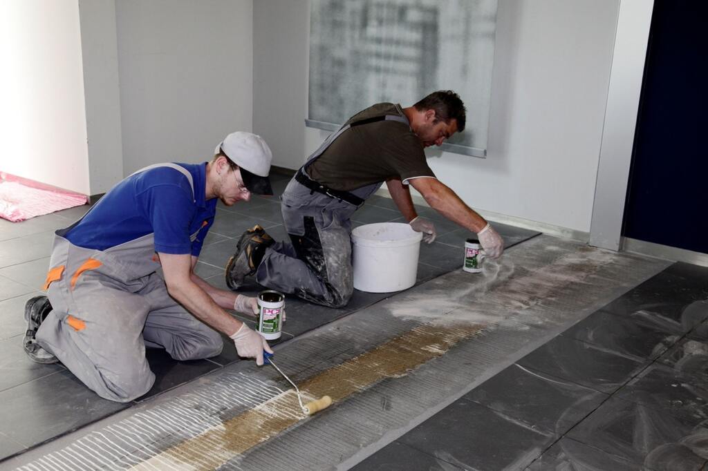 Verlegen von Feinsteinzeugfliesen im Verkaufsbereich bei laufendem Betrieb