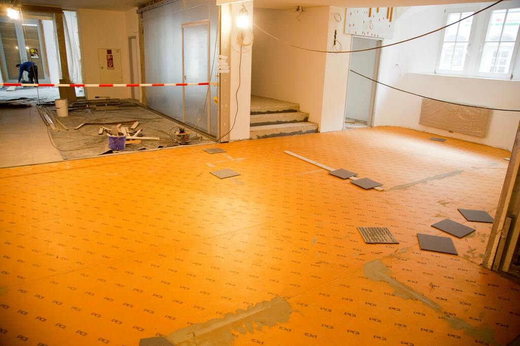 Das bauausführende Unternehmen wandte sich an die Fachberatung der PCI Augsburg GmbH. Falk Findeisen von der PCI Anwendungstechnik in Wittenberg prüfte die Sachlage vor Ort und konnte grünes Licht geben: "Mit dem PCI System 'Gleichmäßiges Fugenbild' war es uns möglich, die Bewegungsfugen im Estrich zu überfliesen, diese versetzt im Oberbelag anzuordnen und somit das optische Erscheinungsbild der großformatigen Fliesen zu erhalten", erläutert der PCI-Anwendungstechniker, "und die Voraussetzungen waren im Foyer des Theaters dafür gegeben." Das Prinzip dieser Systemlösung beruht auf einer Entkoppelung des Belages vom Untergrund bei gleichzeitig solider Verbundhaftung.