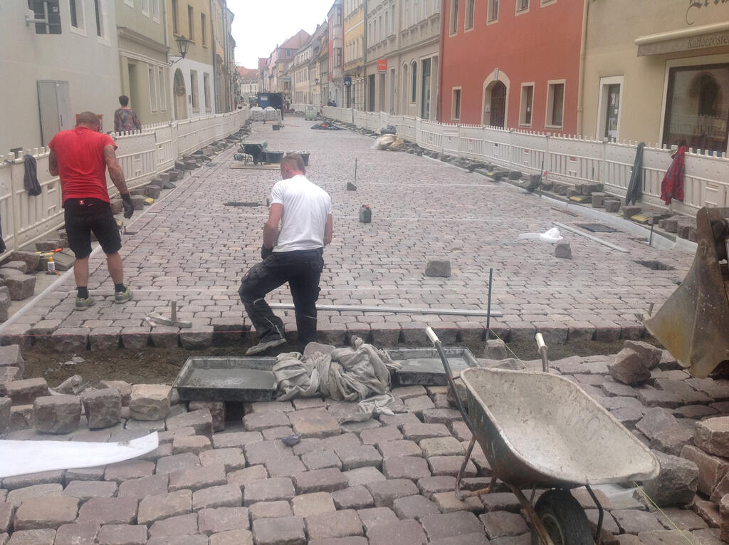 Hochwasserschäden in Pirna: Pflaster in gebundener Bauweise verlegt
