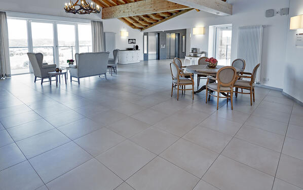 Traumhaft gelegen inmitten des Naturparks Saar-Hunsrück und dem Dreiländereck Deutschland-Frankreich-Luxemburg befindet sich die „Residenz Losheim am See“. In unmittelbarer Nähe zum Stausee Losheim hat die Victor´s Bau und Wert AG eine hochmoderne Senioren- und Pflegeresidenz erbaut. Der Komplex wartet mit einem Appartement-Bereich, dem top-modern ausgestatteten Medicus Gesundheitszentrum sowie Restaurant, Stüberl und Café auf. Baustoffpartner für die großflächige Fliesenverlegung in Bädern, Eingangsbereich, Treppenhaus, Fluren und in der Großküche war die PCI Augsburg. Die beauftragte Firma Reis & Wilhelm GmbH & Co. KG verfügt über das erforderliche Know-how und die Praxiserfahrung mit der Verarbeitung der Produkte. Das Familienunternehmen in dritter Generation arbeitet seit fast 20 Jahren mit dem Augsburger Baustoffhersteller zusammen.