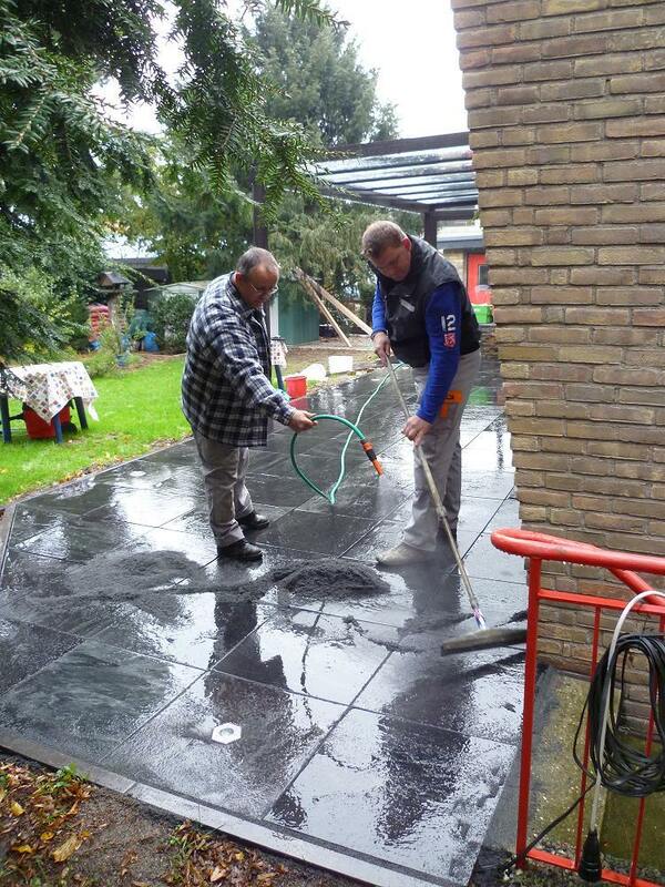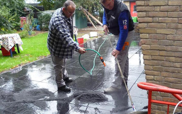 Im Duisburger Stadtteil Baerl steht das Haus der Familie Hinz idyllisch im Grünen. Die zum Teil überdachte Terrasse sollte mit einem neuen Steinbelag renoviert werden. Die PCI-Mitarbeiter Herr Stefan Marx (Anwendungstechnik) und Herr Leo Krüppel (Fachberater) unterstützten den Hausbesitzer mit Beratung und Einweisung bei diesem Vorhaben.