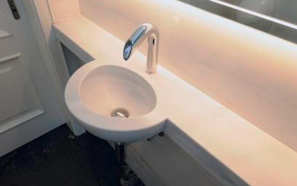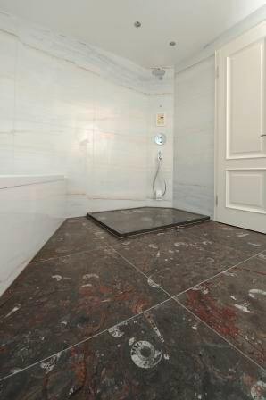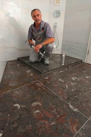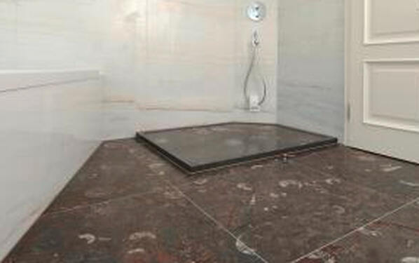 Werkstoffe aus der Natur erzeugen eine wohlige Atmosphäre und bieten mit ihren natürlichen Farben und Musterungen ein schickes Highlight im eigenen Zuhause. Aus diesem Grund entschieden sich die Eigentümer einer Düsseldorfer Wohnung, Marmor für die Einrichtung ihres Badezimmers sowie des angrenzenden Gäste-WCs zu verwenden. Dabei sollten sowohl Wand und Boden bekleidet als auch neue Sanitärobjekte aus dem Naturmaterial gefertigt werden. In Absprache mit dem Architekten legten sich die Bewohner auf zwei unterschiedliche Marmorarten fest: Für insgesamt 28,7 m² Wandfläche in beiden Räumen sowie für das Doppelwaschbecken im Badezimmer und das Handwaschbecken im Gäste-WC wählten sie hellen Göflaner Marmor aus. Der Boden mit einer Größe von 16,45 m² sollte durchgehend mit dem dunklen Fossile Etrusco aus Tunesien belegt werden.