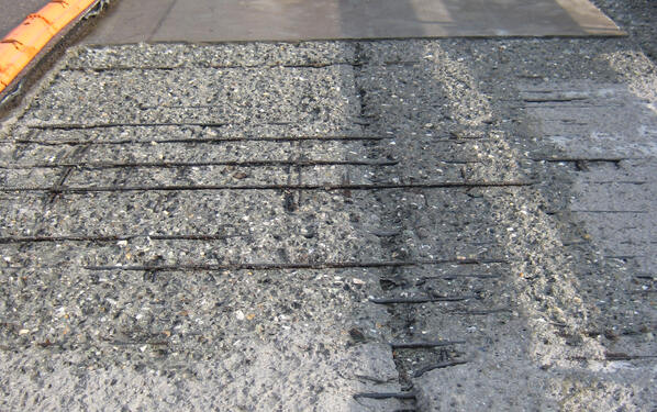 Montag, 2. Mai 2011: Ausbau des Belages und der Abdichtung inkl. Entfernen des schadhaften Betons und Freilegen von Armierungseisen