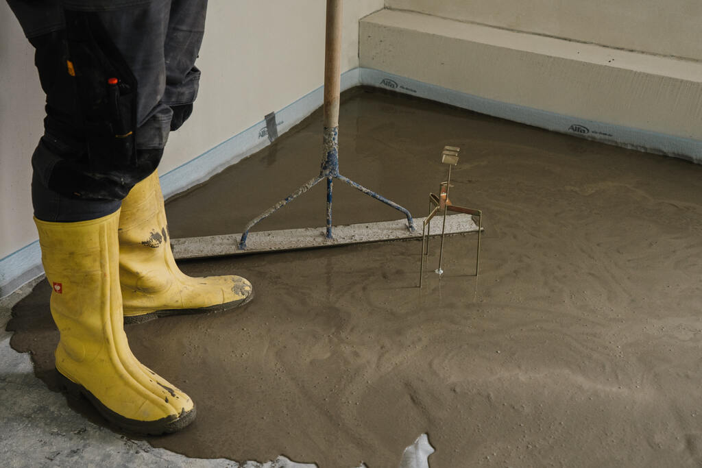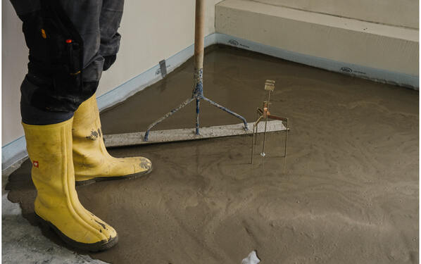 Als Voranstrich für die nachfolgende kaltselbstklebende Dichtbahn verwendeten die Handwerker PCI BT 26. Die hochwertige Allwettergrundierung ist eine wasserverdünnbare, lösemittelfreie Bitumen-Kautschuk-Emulsion, die auf trockenen und feuchten Untergründen einsetzbar ist und schnell trocknet. Mit der radondichten KSK-Dichtbahn PCI BT 21 folgte die Bodenabdichtung gegen nicht drückendes Wasser nach DIN 15533-2 sowie gegen kapillaraufsteigende Feuchtigkeit und als Wasserdampfbremse unter dem Estrich. Die Dichtbahn »Allwetter« besteht aus einer zweischichtigen, reißfesten Valéron®-Spezialfolie und einer stark klebenden Bitumenkautschuk-Dichtmasse. Der spezielle Klebecompound sorgt für dauerhafte Anbindung der Abdichtung auf der Bodenfläche, die selbstklebende Rückseite für die einfache und schnelle Verarbeitung. PCI BT 21 lässt sich sauber und faltenfrei an Ecken und Kanten aufkleben, hat eine definierte Schichtdicke und keinerlei Trocknungszeit. Der Einbau des Estrichs konnte unmittelbar nach dem Aufkleben starten.