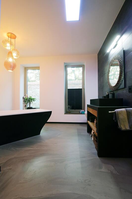 Passend zur modernen Loftarchitektur des Einfamilienhauses sollte ein exklusiver Bodenbelag geschaffen werden. Um den unterschiedlichsten Raumbedingungen zu genügen, sollte er zudem fugenfrei sein. Da einige Zimmer aufgrund großer Fensterflächen stark lichtdurchflutet sind, muss der Bodenbelag thermische Spannungen abbauen können und lichtbeständig sein. In anderen Räumen galt es, den Belag passgenau auf die jeweilige Raumgeometrie und auf die Anschlüsse an bestehende Bereiche anzupassen. Mit PCI Periplan Multi konnten diese Herausforderungen gemeistert werden. Die Bodenspachtelmasse ist leicht verlaufend und fügt sich dadurch einfach in die Raumstrukturen ein. Das spannungsarme Aushärten durch Faserarmierung bei PCI Periplan Multi beugt Rissbildung vor. Darüber hinaus ist das Produkt nach GEV_EMICODE EC 1 PLUS R zertifiziert und trägt aufgrund seiner sehr emissionsarmen Eigenschaft zu einem gesunden Wohnklima bei.
