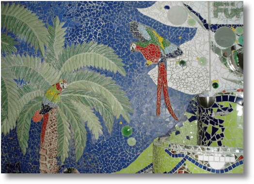 Rund 800.000 Mosaiksteine aus von Hand zerschlagenen Fliesen fügte die Mosaikkünstlerin Iris Rauh mit ihrem Team in feinster Handarbeit zu einem rund 10 Meter langen und insgesamt etwa 31 Quadratmeter großen Wandbild zusammen.