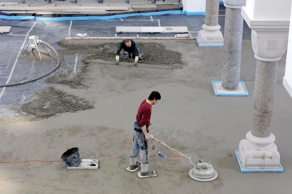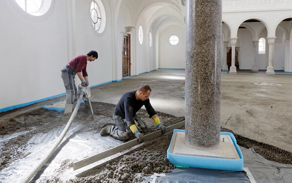 Im Zuge der Innenraumsanierung wurde der neue Zementestrich im Frühjahr 2017 eingebaut. Bauherr und Planer entschieden sich für den Estrich-Schnellzement PCI Novoment Z3, der zugleich die Anforderungen erfüllt, sehr spannungs- und verformungsarm und zudem auch schnell begeh- und belegbar zu sein. PCI Fachberater Stefan Schweizer war in beratender Funktion vor Ort und erstellte gemeinsam mit Planer und Verarbeiter den Schnitt- und Fugenplan, betreute den Einbau und unterstützte bei der Koordination der Baustelle.