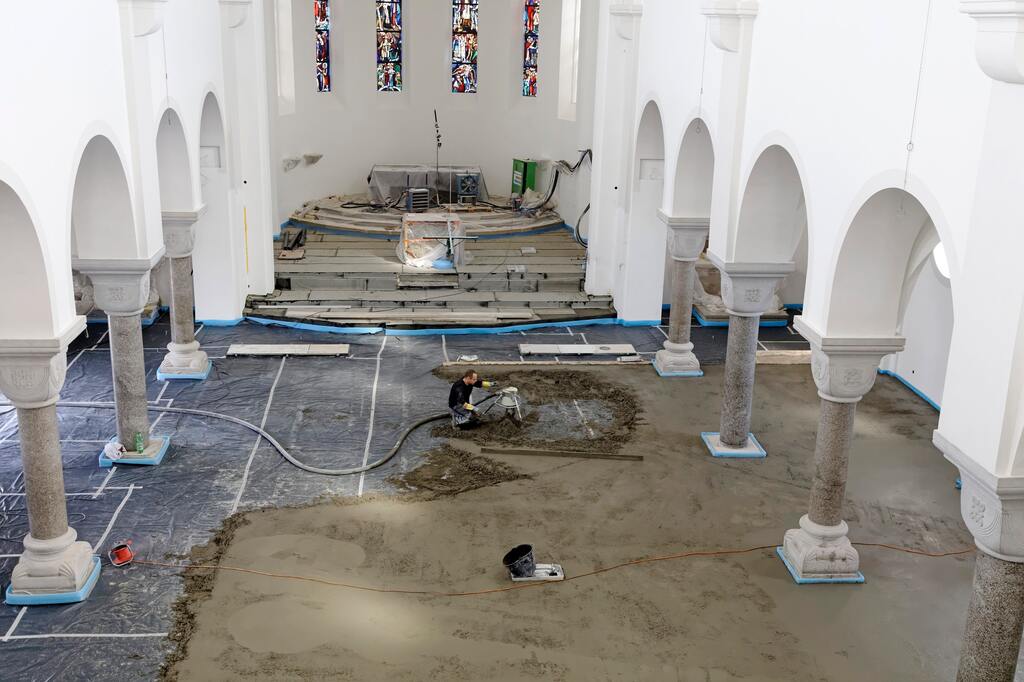 Die Verlegung von Parkett oder Fliesen erfordert einen hochwertigen und stabilen Estrich, der die Druckverteilung reguliert und eine gleichmäßige Fußbodenhöhe schafft. Die Anforderungen an den neuen Estrich in der Kirche St. Margaretha gingen aber weit darüber hinaus: Das Gefälle vom Chorraum zum Haupteingang und die entsprechende Anpassung zu den Seitenausgängen verlangten unterschiedliche Einbauhöhen, so dass der Estrichbelag in seiner Schichtstärke von 40 bis 100 mm variierte. Die größte Herausforderung stellte jedoch der ansatzfreie Einbau der großen, außerhalb der Norm liegenden Estrichflächen von rund 140 m², 216 m² und 236 m² dar, inklusive Säulen und einem sehr verwinkelten Bereich im Hochaltar.