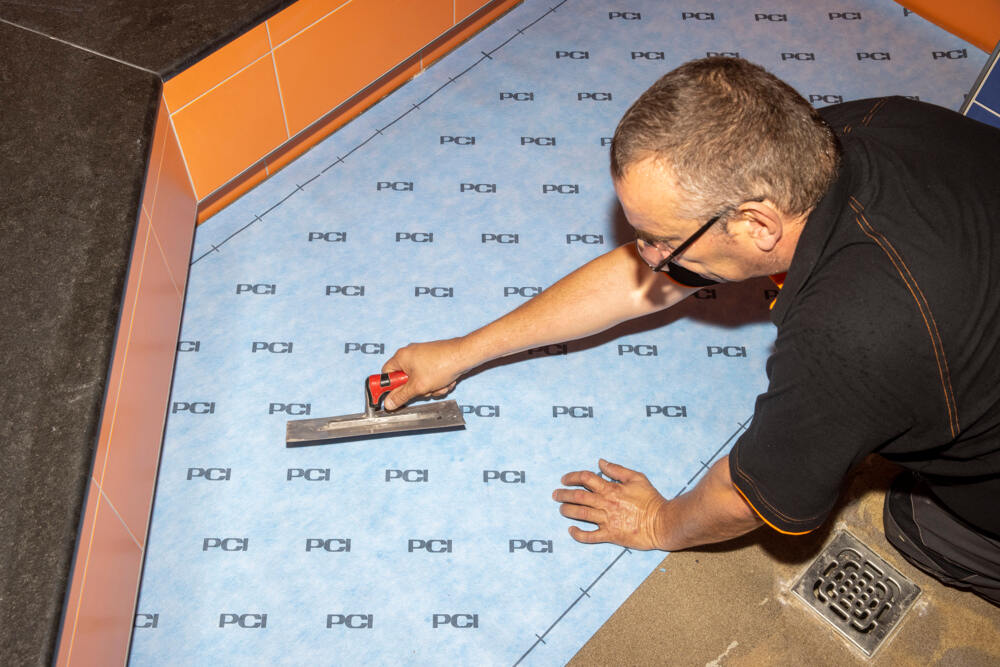 Auf dem Boden des Dampfbads erstellte Wolfgang Peters die Abdichtung mit PCI Apoflex® F. Anschließend klebte er darauf die Abdichtungsbahn PCI Pecilastic® W mit dem leichten variablen Flexmörtel PCI Nanolight® als zusätzliche Entkopplung. Diese Vorgehensweise ermöglicht eine schnelle Arbeitsabfolge: Ohne Trocknungszeiten kann der nachfolgende Keramik- oder Naturwerksteinbelag sofort aufgebracht werden. Auch PCI Pecilastic® W hat das allgemeine bauaufsichtliche Prüfzeugnis für die Beanspruchung A, B und C und eignet sich speziell für Dampfkabinen (Wassereinwirkungsklassen W2-I oder W3-I gemäß DIN 18534). Pecilastic® W ist wie der Flexmörtel PCI Nanolight® sehr emissionsarm nach GEV EMICODE EC1 PLUS.