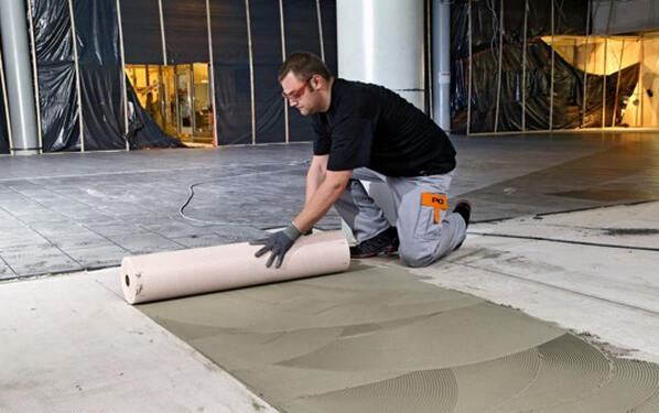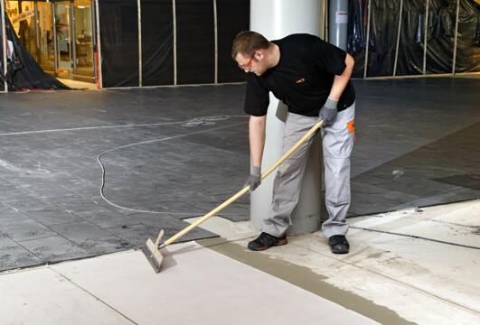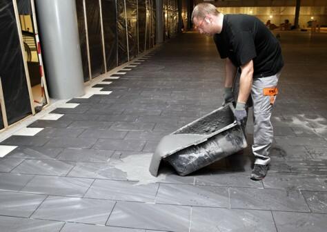 Der vorhandene, fest sitzende Terrazzobelag wurde sandgestrahlt und mit der Spezial-Haftgrundierung PCI Gisogrund 404, 1:1 mit Wasser verdünnt, grundiert. Um einen absolut planebenen Untergrund zu schaffen, wurde die komplette Verlegefläche mit PCI Nivelliermasse im Mittel zwischen 3 bis 10 mm überspachtelt. Aufgrund der großen Fläche und Menge an zu verarbeitender Nivelliermasse brachten die Handwerker die Spachtelmasse mittels Pumpen auf. Dann folgte die vollflächige Verklebung des Entkopplungsgewebes PCI Pecilastic mit dem flexibilisierten Fliesenkleber PCI FT Extra. Diese Vorgehensweise bietet eine zusätzliche Sicherheit und sorgt für das zuverlässige Entkoppeln unter Keramik- und Naturwerksteinbelägen. Bei der Verarbeitung sind Hohlstellen beim Eindrücken des Gewebes in den Kleber zu vermeiden. Für die möglichst hohlraumarme Verlegung der Fliesen kam der Klebemörtel PCI FT Extra im Buttering-Floating-Verfahren zur Anwendung. Die im Terrazzountergrund vorhandenen Bewegungsfugen wurden übernommen. Für das Verfugen verwendeten die Fachleute den schnellen Flexfugenmörtel PCI Rapidfug, der sich durch die geschmeidige Konsistenz komfortabel verarbeiten lässt und schnell erhärtet. Die Wartezeit zwischen Einfugen und Waschen des Belages ist dadurch äußerst kurz.