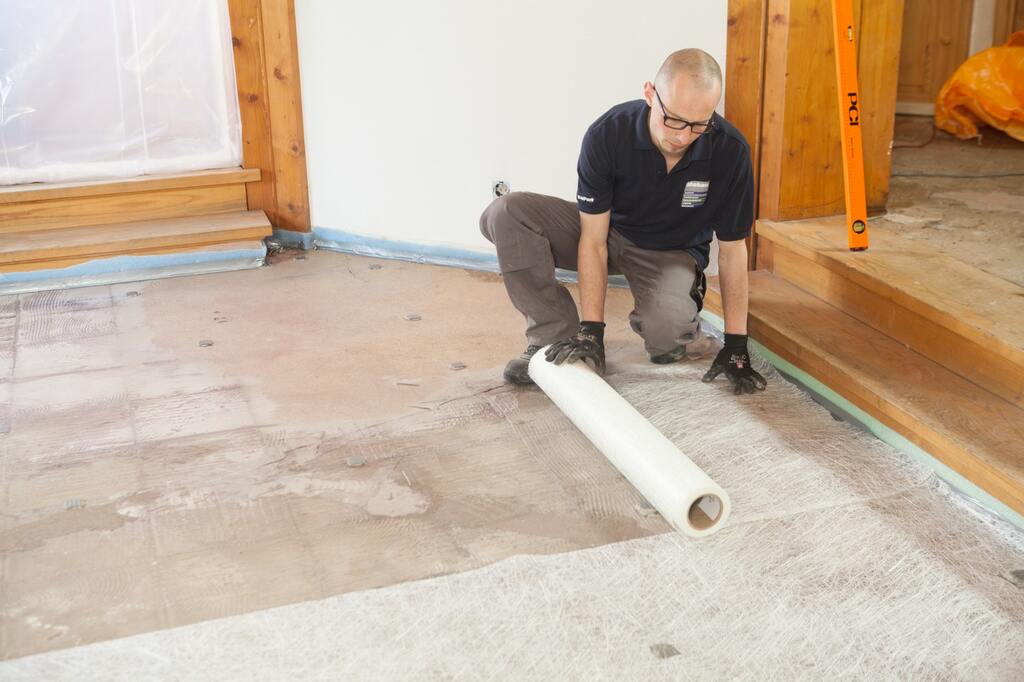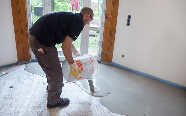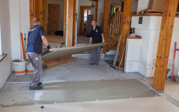 Die Untergrundsanierung stellte bei diesem Projekt eine besondere Herausforderung dar: Im Wohnzimmer war der Heiz-Estrich teilweise defekt und nur eine geringe Aufbauhöhe verfügbar. Den systematischen Aufbau führte der Fliesenleger auf Anraten von PCI-Anwendungstechniker Lukas Lukuc wie folgt aus: Mit PCI Gisogrund 404 erfolgte zunächst die Grundierung des Zementestrichs. Für den Verbundausgleich kam die Glasfaser-Verstärkung PCI Armiermatte GFM zum Einsatz, um die nachfolgende Bodenausgleichsmasse PCI Periplan Extra zu verstärken und deren Zugfestigkeit zu erhöhen. Die Ausgleichsmasse wurde auf dem Untergrund ausgegossen, mit einer Kufenrakel verteilt und mit der Stachelwalze entlüftet und fein nivelliert.