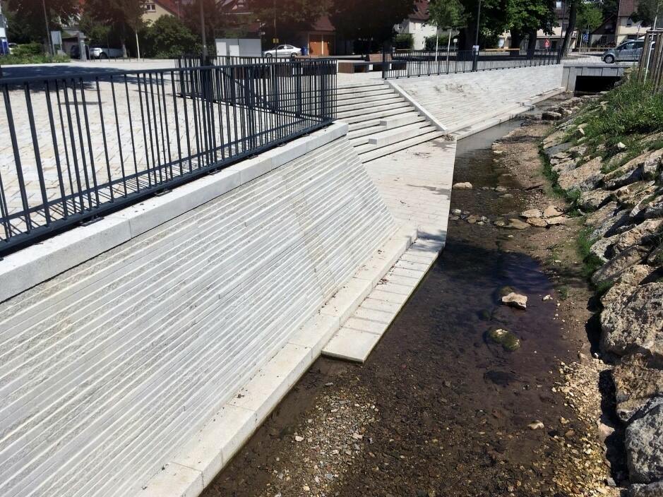 Damit die Gartenschau pünktlich am 10. Mai 2019 öffnen konnte, mussten die Arbeiten im Winter durchgeführt werden. Damit stellte sich die dringliche Frage nach Baustoffen, die sich auch bei niedrigen Temperaturen gut und sicher verarbeiten lassen: Es sollten Granitplatten auf rund 60 Quadratmetern verlegt und ein Schichtmauerwerk auf rund 80 Quadratmetern erstellt werden. Zusammen mit dem beauftragten Bauunternehmen Hoyler war die PCI Augsburg GmbH schon bei der Planung mit im Boot. Auf Empfehlung von PCI-Fachberater Alfred Haug führten die Handwerker die Verlegung der Granitplatten mit dem Verlegemörtel PCI Carrament aus. Für die Untergrundvorbereitung kam zuvor die Haft- und Schutzgrundierung PCI Gisogrund und PCI Pericret als Ausgleichsmörtel zur Anwendung. Eine Herausforderung für die Handwerker stellten die sehr schweren und unterschiedlich dicken Natursteinplatten dar. Hilfreich war die einfache Verarbeitung von PCI Carrament: Der Verlegemörtel lässt sich dank seiner plastisch geschmeidigen Konsistenz mit Hilfe einer Mittelkelle ohne große Anstrengung aufbringen. Wichtig für die Verwendung im Außenbereich und bei niedrigen Temperaturen: PCI Carrament ist dauernassfest sowie frostbeständig und gleicht aufgrund seiner Verformungsfähigkeit Temperaturschwankungen und Untergrundspannungen aus. Durch das schnelle Erhärten sind die mit PCI Carrament verlegten Natursteine bereits nach rund sechs Stunden verfugbar. Dies erfolgte bei der Plattenverlegung am Götzenbach mit PCI Pavifix CEM ROC.