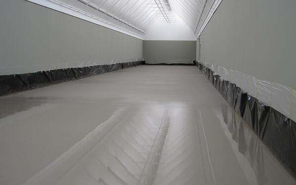 Für die außergewöhnliche Ausstellung sollte die Ausstellungshalle von 70 m Länge und 8,5 m Breite möglichst naturnah als Betonhoffläche gestaltet werden. Der Untergrund bestand aus 43 mm starken Holzdielen, ausgebildet als Schwingboden. An den geplanten zementären Untergrund stellten sich folgenden Anforderungen: Einerseits musste die rückstandsfreie Entfernung nach Ende der Ausstellung garantiert sein, andererseits sollte der Untergrund der Belastung durch den zu erwartenden Besucheransturm gewachsen sein und gleichzeitig vermieden werden, dass sich ein möglicher Abrieb des Untergrundes im Hause verteilte. Nach intensiven Gesprächen mit Herrn Dipl.-Ing. Ingo Grollmisch von der anwendungstechnischen Abteilung der PCI Augsburg GmbH wählte die ausführende Firma Grafite GbR aus Darmstadt folgenden Aufbau: