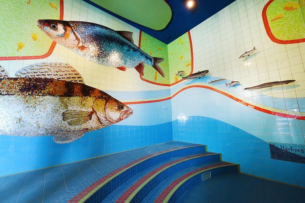 Interessierte Besucher können sich vor Ort über die Fischwanderungen informieren, und die Fische dabei sogar beobachten. In einem an die Stiege angrenzenden, unterirdischen Raum gibt eine große Glasscheibe den Blick frei auf die Fischtreppe. Das Besondere daran ist die kunstvolle Gestaltung: An den Wänden und auch an einer Mauer im Außenbereich hat Fliesenlegermeister Edwin Harbers beeindruckende Fischmotive mit einer Länge von bis zu vier Metern mit Mosaiken verlegt. Anhand der Entwürfe des Künstlers Paul Wieggers legte er die Glasmosaike in seiner Werkstatt in bis zu 80 unterschiedlichen Farben auf 3,5 Zentimeter starke Kerlite-Platten ein. Die fertigen Werke montierte und verfugte Harbers anschließend vor Ort. Eine aufwendige Arbeit: Bis zur Fertigstellung flossen rund 200 Arbeitsstunden in jedes Fischmotiv.